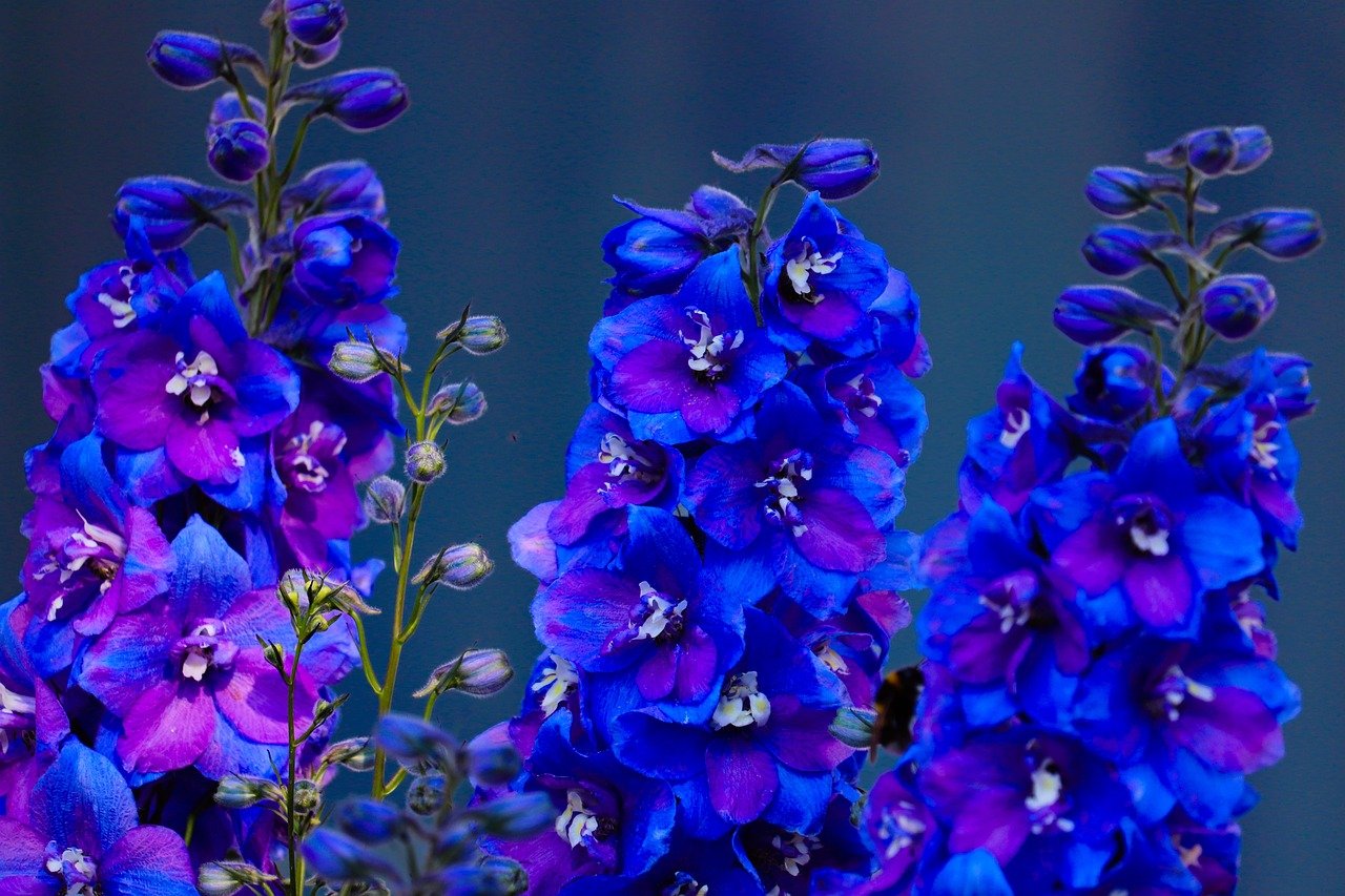 - 물 관리와 꽃대 유지 방법 : 델피니움은 물을 좋아하긴 하지만, 그렇다고 해서 자주 흠뻑 주면 오히려 뿌리가 약해질 수 있습니다. 가장 좋은 방법은 흙의 겉 부분이 살짝 말랐을 때 충분히 물을 주는 방법입니다. 특히 여름처럼 덥고 습한 계절에는 과습에 더 약하기 때문에 신경을 많이 써야 합니다. 이럴 때 뿌리 주변에 짚이나 우드칩 같은 멀칭 재료를 덮어두면 수분 증발도 막고, 뿌리의 온도도 일정하게 유지할 수 있어서 훨씬 도움이 됩니다. 그리고 델피니움의 매력 중 하나인 꽃대 관리도 잊으면 안 됩니다. 델피니움은 키가 1.5~2m까지 자라다 보니, 바람이 세게 불거나 비가 오면 쓰러질 수 있어서 튼튼한 지지대를 세워주고 줄기를 살짝 느슨하게 묶어주면 안정적으로 키울 수 있습니다. 또 꽃이 다 피고 난 꽃대는 바로 잘라내는 게 좋습니다. 그래야 새로운 꽃대가 나오고, 식물도 불필요한 에너지를 쓰지 않아 더 건강하게 자랍니다. 이렇게 정성껏 관리해 주면 여름 내내 델피니움의 화려한 자태를 오래 즐기실 수 있습니다.